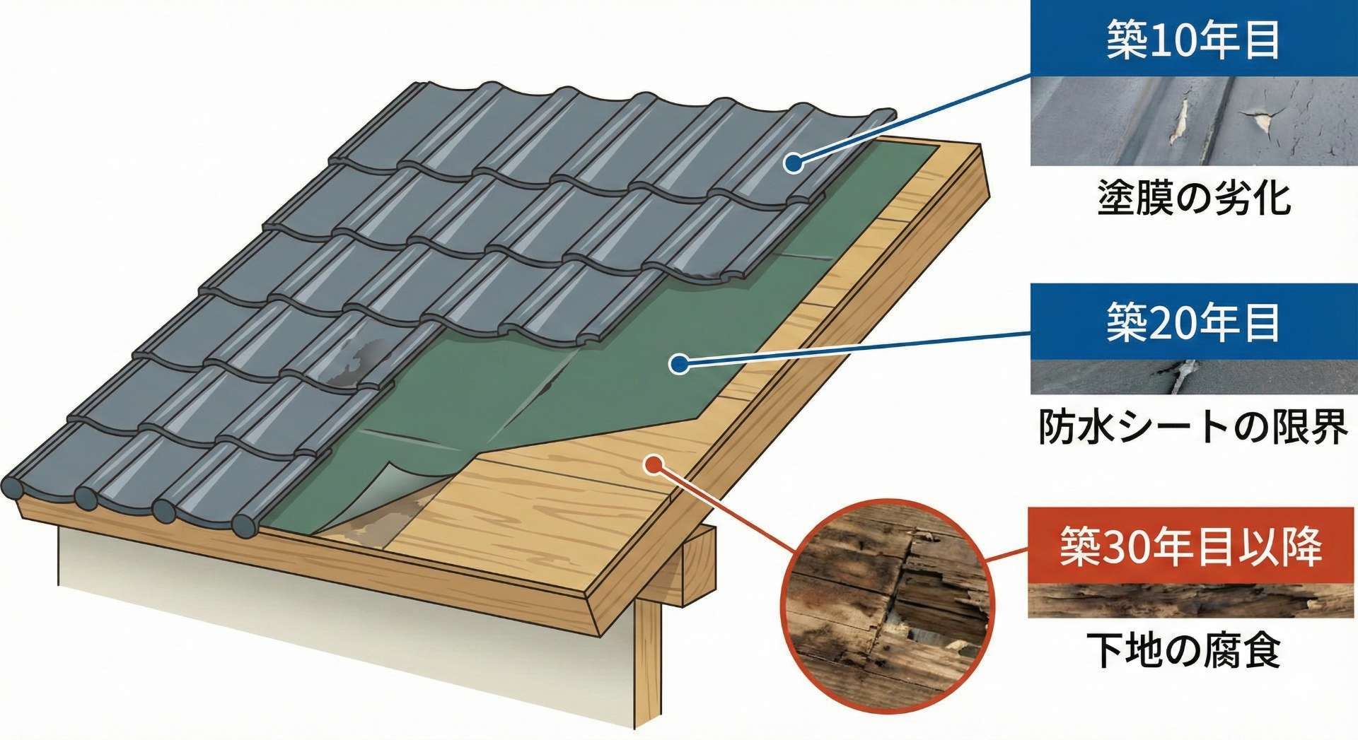 - 築10年が最初の節目: 新築保証が切れ、塗膜の防水性が失われる時期。塗装メンテナンスで屋根の寿命を延ばしましょう。