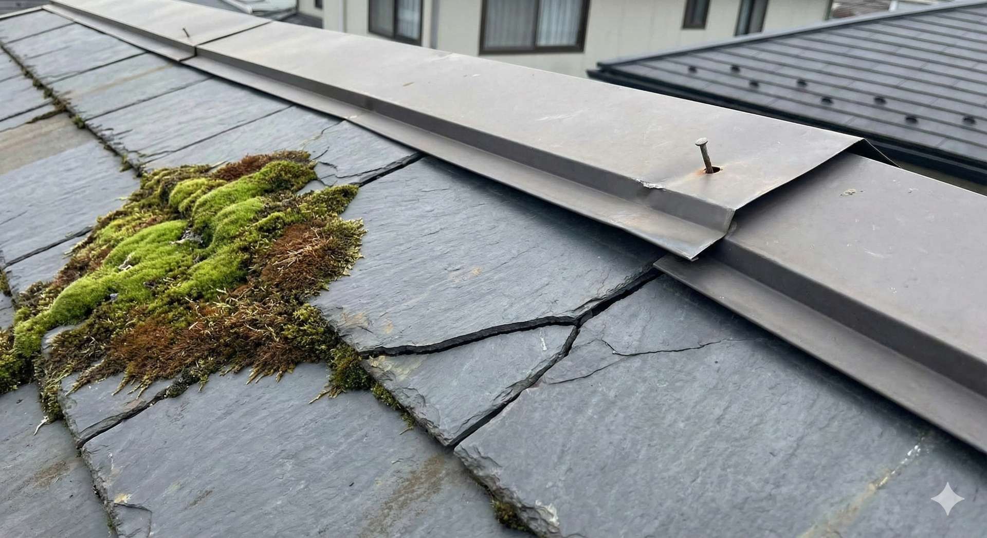 特にコケは要注意です。コケは水分を含んで繁殖するため、コケがある場所は常に湿った状態(湿潤状態)になっています。スレート屋根などのセメント質系素材は、長時間水分を含むと中性化が進み、非常にもろくなります。
